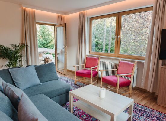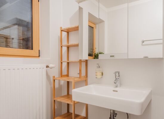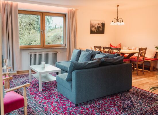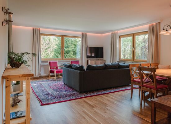 Waldgarten verfügt über eine geräumige, 95 m2 große Wohnung im Erdgeschoss. Der Zugang zur Wohnung erfolgt vom Parkplatz aus über eine separate Außentreppe. Es ist ideal für Familien oder eine Gruppe von Erwachsenen, da es zwei Schlafzimmer mit 5 Betten, eine große neue Küche und einen geräumigen Wohn- und Essbereich gibt. Im Wohnzimmer befindet sich ein Schlafsofa, auf dem 2 weitere Personen schlafen können.