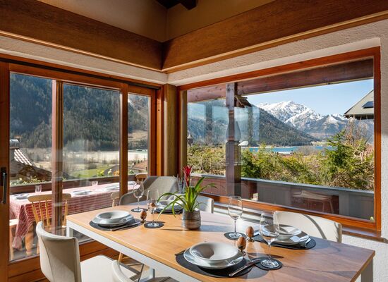 Das Ferienhaus bietet Ihnen eine großzügige und helle Wohnfläche, die mit viel Liebe zum Detail eingerichtet wurde. Genießen Sie den atemberaubenden Seeblick sowie den Blick auf den majestätischen Bärenkopf vom Balkon oder der gemütlichen Terrasse. Die Sonne begleitet Sie den ganzen Tag und schafft eine warme, einladende Atmosphäre, die zum Entspannen und Verweilen einlädt. Stellen Sie sich vor, wie Sie morgens bei einer Tasse Kaffee die ersten Sonnenstrahlen genießen oder abends bei einem Glas Wein den Sonnenuntergang bewundern.