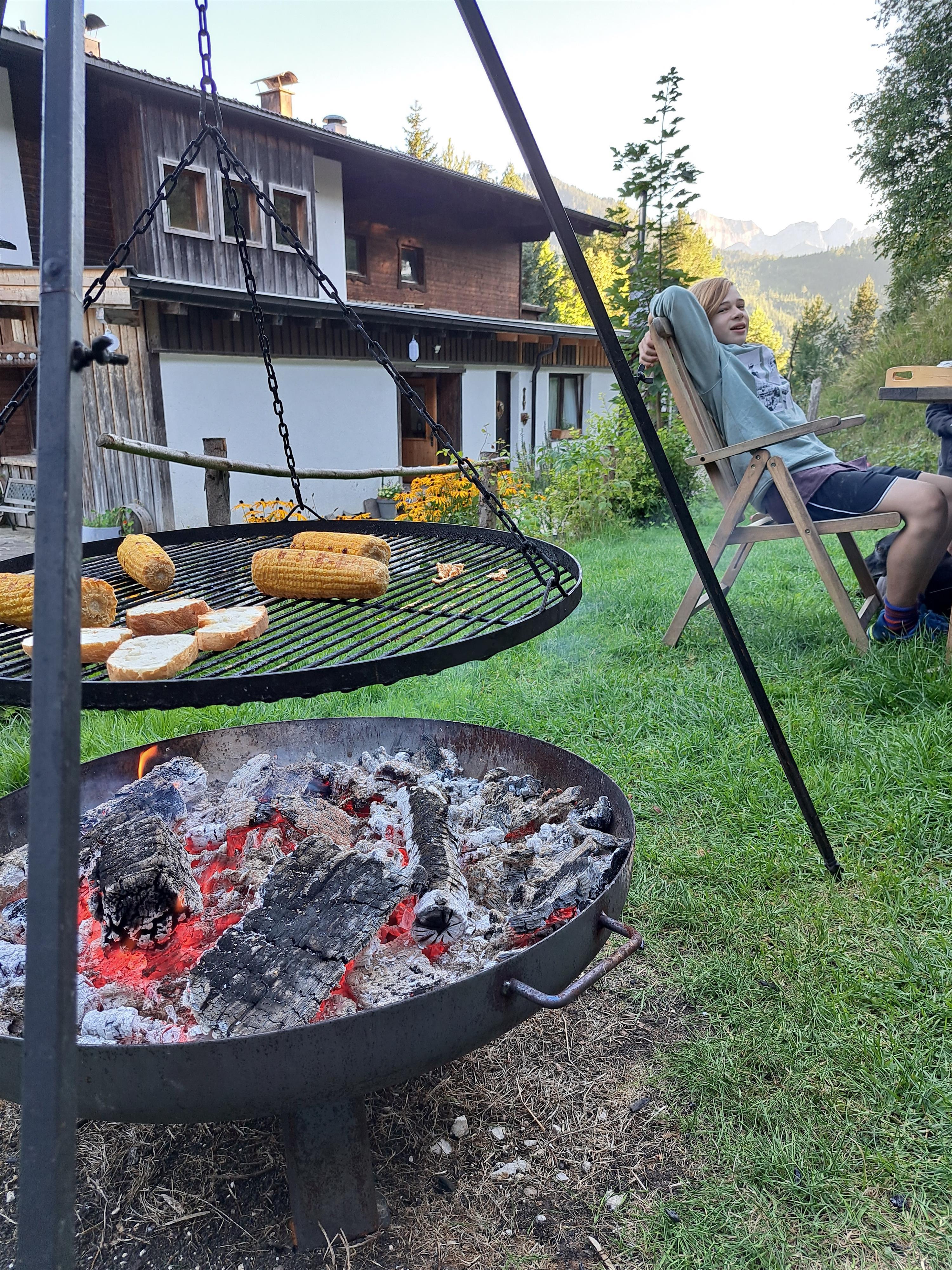 Im Sommer ist der umliegenden Naturgarten mit der Feuerstelle und 3-Bein Grill Treffpunkt zum Plaudern, Essen und Spielen. Outdoorspiele wie das 5m Trampolin, der Basketballkorb uvm. warten auf Groß und Klein.