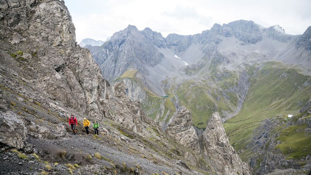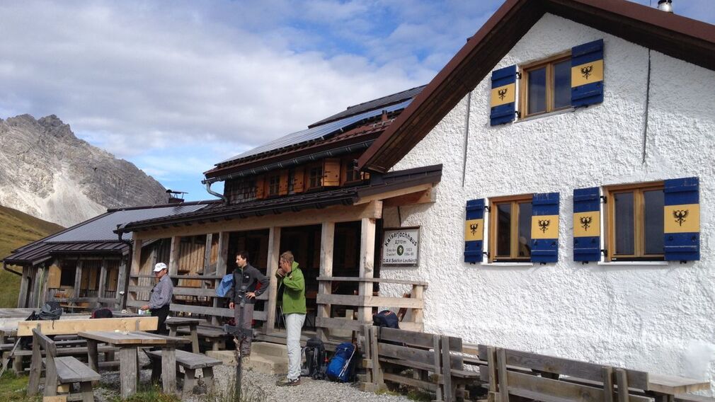 trail description: Start off at Ansbacher Hut and gently ascend on a well-defined singletrack trail up to Flarschjoch Saddle. Just below the saddle, you have the option of branching off to Memminger Hut; the Eagle Walk gently descends across scree slopes and meadows from Flarschjoch Saddle, heading towards Knappenböden. There, the trail levels off and continues ahead across scree slopes to Alperschonjoch Saddle, which has a little cross at its top. Beyond the saddle, the trail slightly descends before resuming its climb in switchbacks; eventually the trail winds down to Vordersee Lake. This section skirting the southern side of spectacularly rugged Vorderseespitze Spire is called Haas-Weg Trail. Haas-Weg Trail mostly crosses meadows as well as exposed and steep rock flanks and cornices; many sections are assisted by a fixed anchoring system of cables. From Vordersee Lake, the trail begins a gradual climb and heads towards Hinterseejoch Saddle. As you approach the saddle, the ascent steepens, with the trail following an earthy footpath that zigzags up to the dip. Beyond Hinterseejoch Saddle, the trail heads gradually downhill in switchbacks. Some distance ahead, the trail traverses scree slopes westward, slightly descending, before resuming its climb below Kridlonscharte Notch for a short distance. Here, the soil can be earthy and slippery in wet conditions. Eventually, climb up to Kridlonscharte Notch, with the trail following a rocky footpath through exposed and rugged terrain and across a chimney where fixed cables are mounted. On the other side of the notch, the trail descends on a winding footpath through mountain meadows, passing by a rock ledge. Soon, the trail heads westward and traverses the slopes leading to Kaiserjochhaus Lodge. In this section, the scant trail is exposed to steep drop-offs in rugged terrain with many ups and downs; many sections are assisted by a fixed anchoring system of cables. Eventually, continue ahead through meadows to reach the destination end of this walk, inviting Kaiserjochhaus Lodge at an elevation of 2,310 metres.